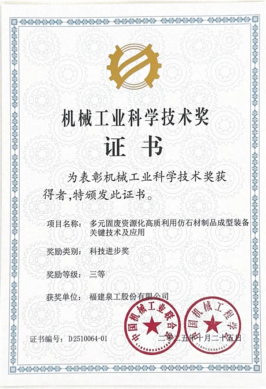Нещодавно було офіційно оголошено список переможців премії China Machinery Industry Science and Technology Award 2025. Проект «Ключові технології та застосування формувального обладнання для високовартісної утилізації різноманітних ресурсів твердих відходів у імітацію виробів з каменю», очолюваний компанією Fujian Quangong Machinery Co., Ltd., отримав третій приз за технологічний прогрес. Ця нагорода повною мірою свідчить про високе визнання вQuangong Machinery Co., Ltd.технологічні інноваційні можливості та досягнення інженерних застосувань у сфері високоцінної утилізації твердих відходів та інтелектуального обладнання для формування імітованих виробів з каменю.