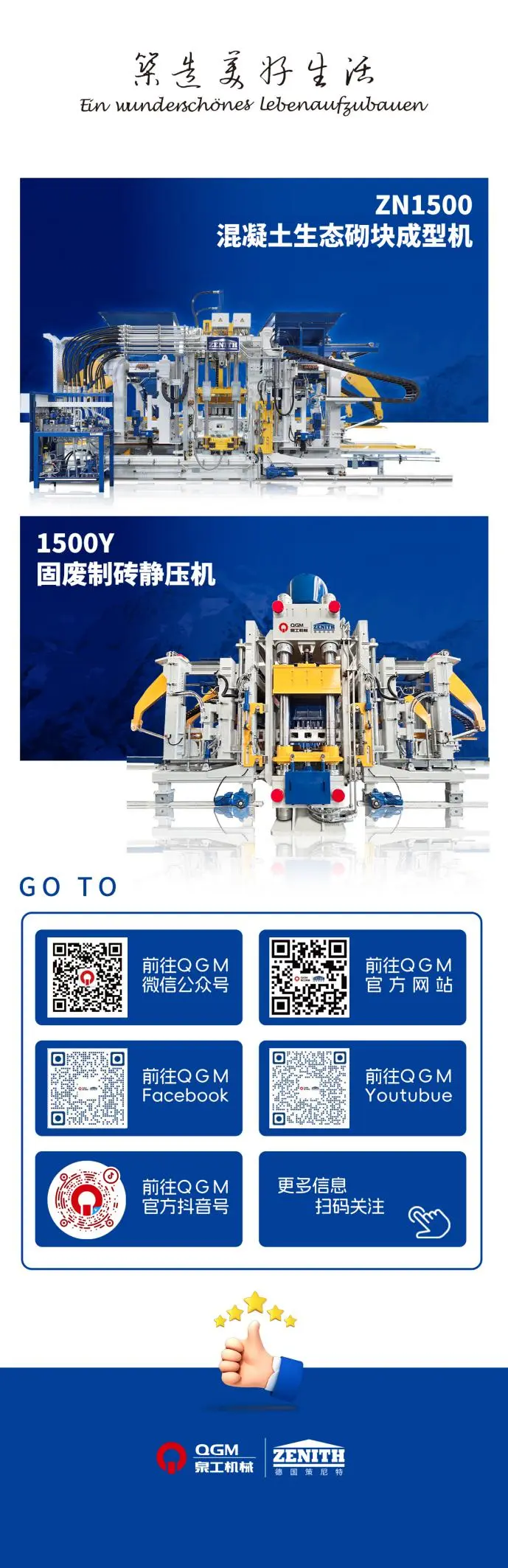 Продукція серії Quangong ZN виробляється в Китаї в суворій відповідності до німецьких виробничих технологій і процесів. Порівняно з машинами для формування блоків вітчизняних брендів, продукти серії ZN мають більш плавний рух, вищу ефективність виготовлення цегли та меншу кількість відмов. З точки зору продуктивності, ефективності, енергозбереження та захисту навколишнього середовища вони значно випереджають аналогічні продукти в Китаї.