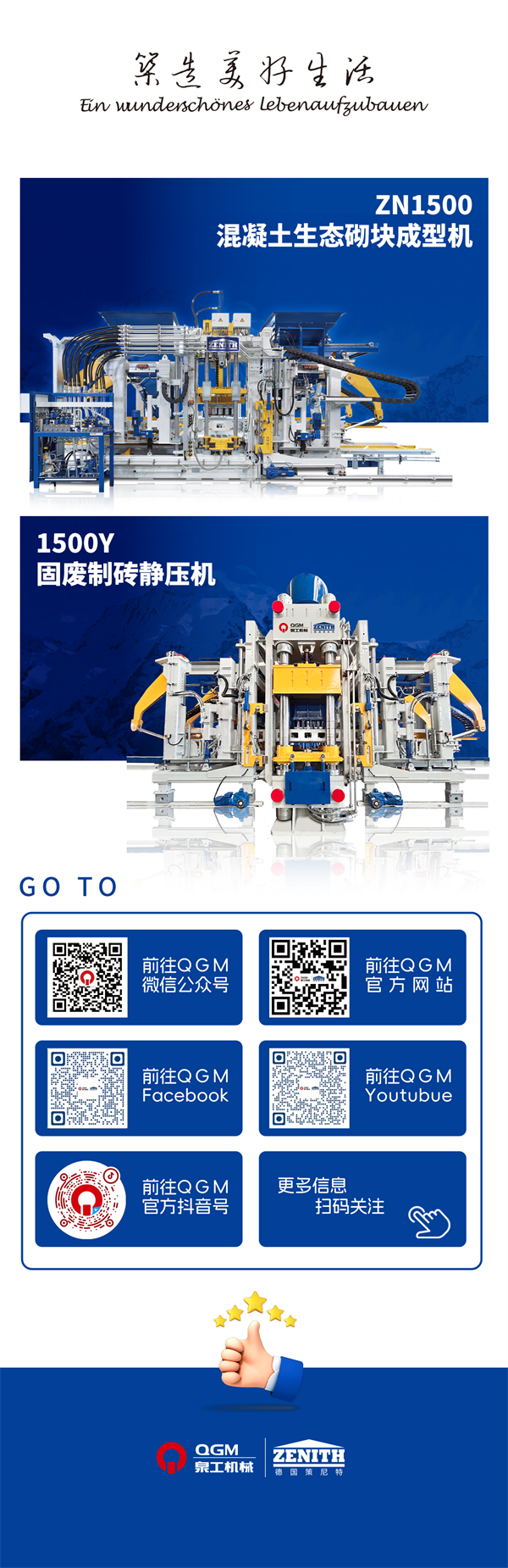 Як провідний бренд у вітчизняній цегельній промисловості, QGM протягом багатьох років незмінно входить до числа провідних підприємств Цюаньчжоу. На сьогоднішній день компанія отримала понад 300 патентів на продукцію, 21 з яких є патентом на винахід, авторизованим Державним відомством інтелектуальної власності. У 2014 році компанія повністю придбала компанію Zenith, всесвітньо відомого німецького виробника машин для виготовлення безпіддонної цегли з понад 60-річною історією, офіційно розпочавши глобальну стратегічну експансію. Повністю інтегруючи передові німецькі технології та використовуючи десятиліття виробничого досвіду, QGM постійно впроваджує інновації та розробляє низку конкурентоспроможних на міжнародному рівні моделей високого класу. Ця продукція експортується в понад 60 країн і регіонів в рамках ініціативи «Один пояс, один шлях», заслуживши високе визнання на світовому ринку.