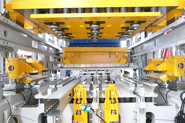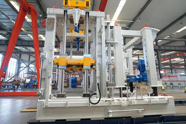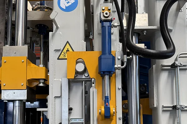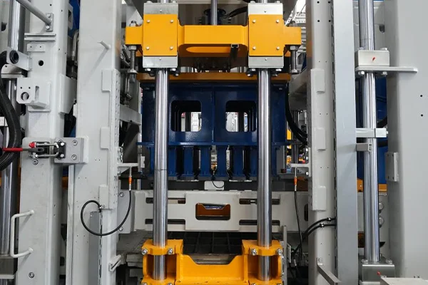 7Пристрій блокування головки преса Цей механічний запірний механізм складається з високоміцних запірних блоків, клиноподібної прес-головки та гідроциліндрів подвійної дії. Під час виймання з форми циліндри приводять у рух фіксуючі блоки, радіально затискаючи головку преса, утворюючи механічний тупик. Потім форма випускається під постійним тиском, ефективно усуваючи пружний відскок і мікрорух — забезпечуючи гострі краї цегли, гладкі поверхні та значно покращений рівень якості продукції.